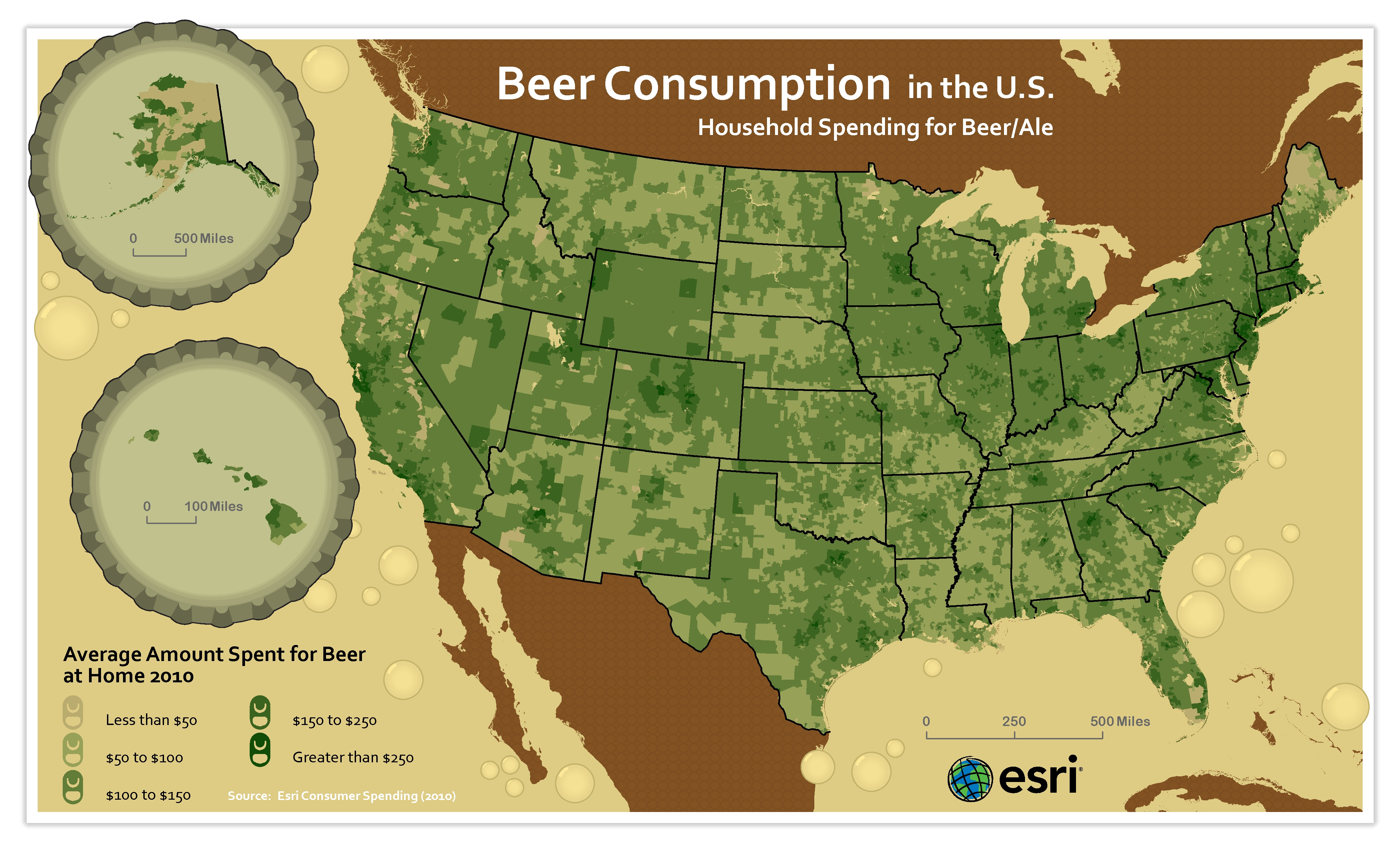 Want to learn more, whether about American beer-buying habits or any of hundreds of other products and services that consumers purchase every year? Consult Esri’s 2010 Consumer Spending database, which identifies hundreds of items in categories such as Apparel, Financial, Food & Beverage, Entertainment & Recreation, and Household Goods & Services. You can use this database to: