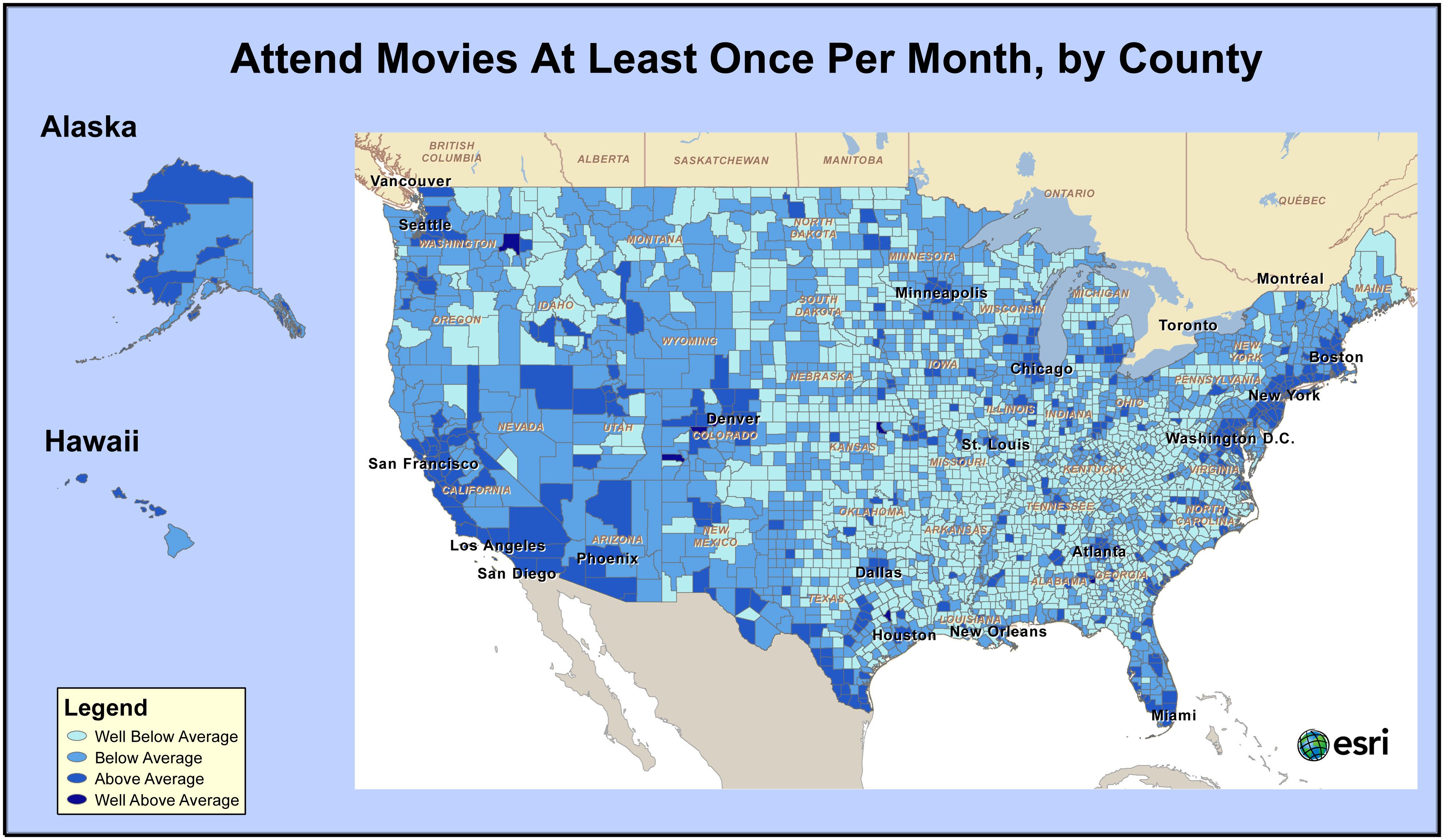 LifeModes and Urbanization can also be used to classify consumers. Segments within a LifeMode group share an experience such as being born in the same period or a trait such as affluence. Urbanization summary groups share a locale, from the urban canyons of the largest cities to the rural lanes of villages or farms. In this case, no one LifeMode or Urbanization group dominates but there are some trends. 80% of census block groups where Scholars and Patriots dominate have an index of at least 125 or more for attending the movies at least once a month. Principal Urban Centers I, an Urbanization group, has an index of 67%.