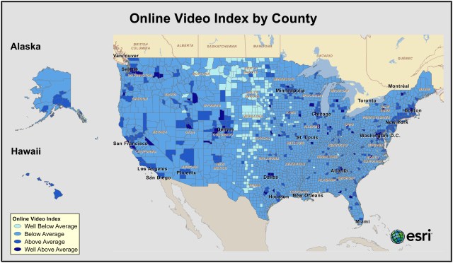 As expected, people on the west and east coasts index high for online video viewers. This means individuals in those areas are more likely to watch video online than in other parts of the country. An index of 100 represents the average US consumer. A higher index means there is more demand for a product or service in a given area.