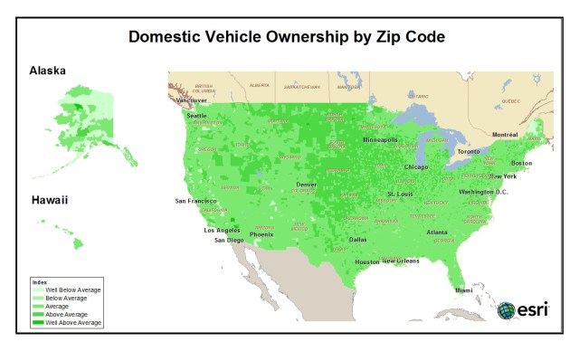 Each of these zip codes have an index of 151 for domestic car ownership or lease meaning a household is 1.51 times more likely to own or lease a domestic-made vehicle than the average American.
