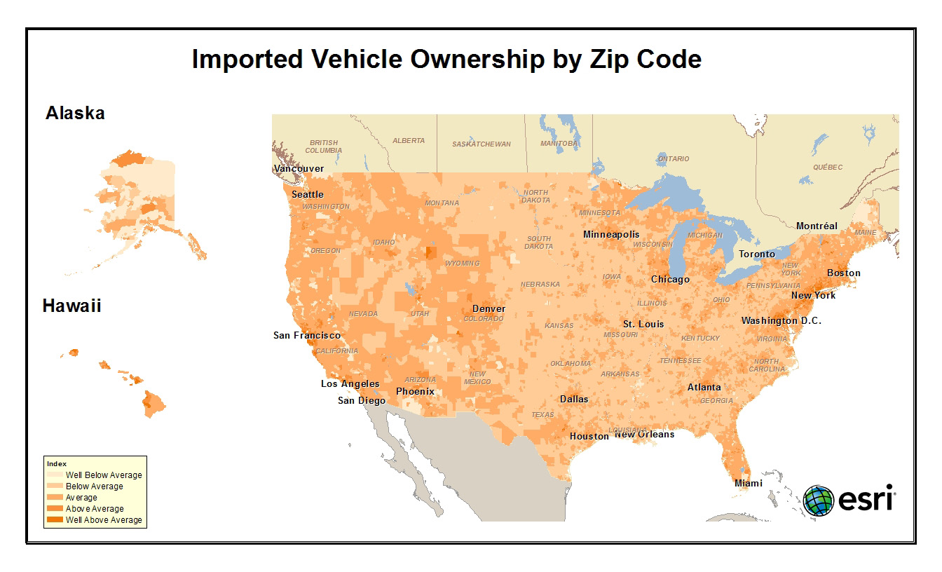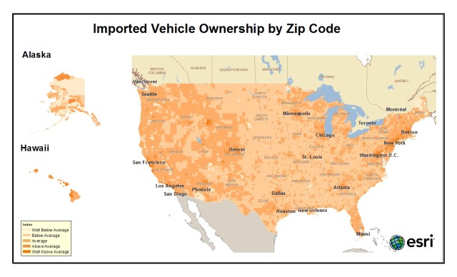 Each of these zip codes had an index of 167. This means that a household in that area is 1.67 times more likely than the average American to own or lease an imported vehicle.