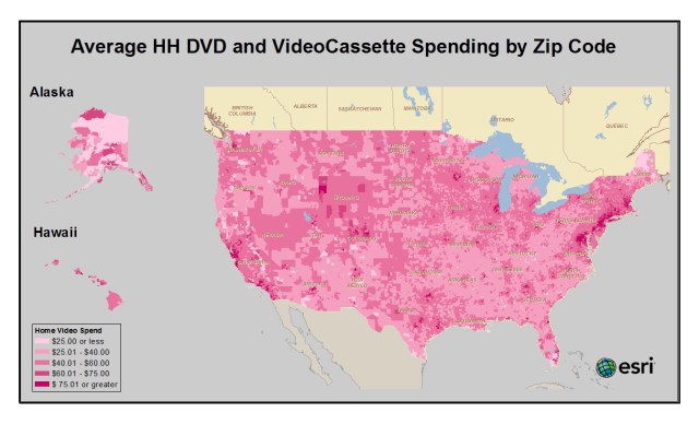 Let’s first tackle how much people spend on DVDs. The average household in the United States spends approximately $50.76 per year on DVDs and video cassettes. (Going forward we will just refer to DVDs since the VHS market is very small, but the numbers encompass both.) The zip codes where households spend the most on DVDs live primarily along the eastern seaboard and in some California coastal cities. The zip codes with the top average household spending on DVDs are: