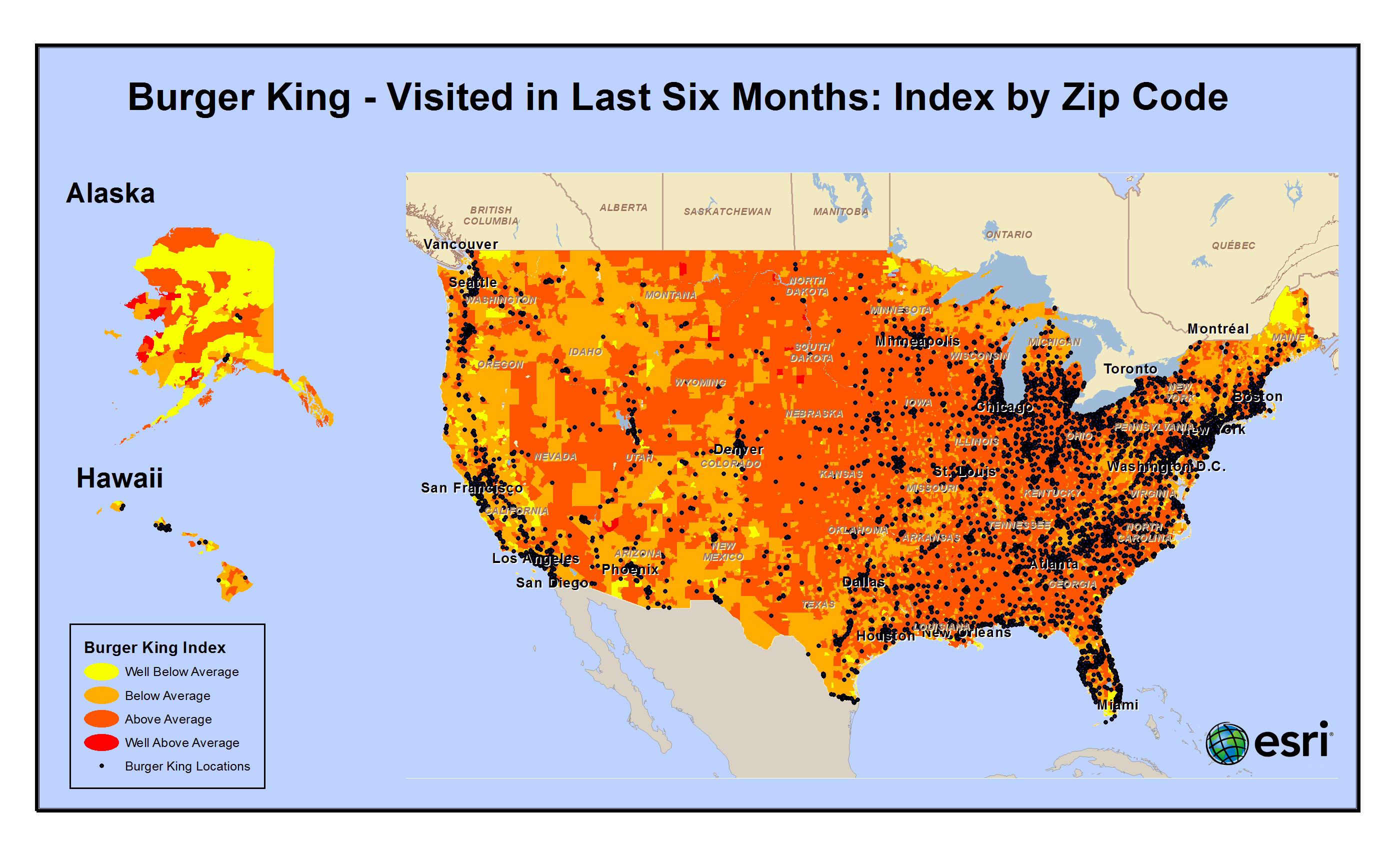 With over 12,500 stores worldwide, Burger King is one of the most popular hamburger franchises in the world. Over half of their franchises are located in the US. The majority of these are located in the eastern part of the United States – but franchises are all over. Over 27% of the US population has visited a Burger King in the last 6 months. No one area of the country seems to dominate the visits, though consumers living in the mid-west and east tend to frequent the restaurant as a whole more than those in the west.