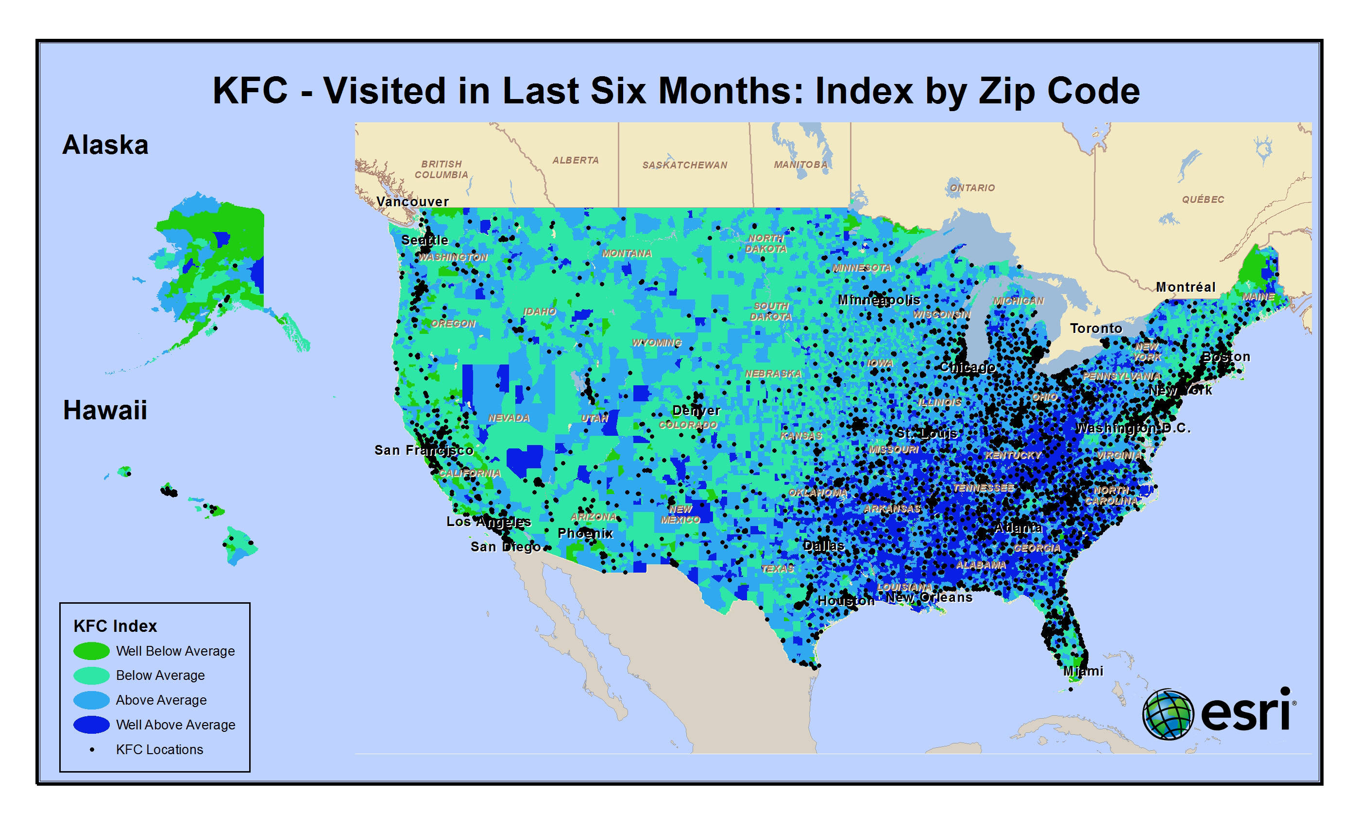 Several tapestry segments are composed of residents who frequent KFC. They are Family Foundations, Heartland Communities, Southern Satellites, City Strivers, Urban Rows, Rural Bypasses, and Rooted Rural. 100% of the census block groups where each of these are dominant have an index of 125 or higher for visiting KFC at least once in the last 6 months. The majority of these tapestry segments are part of the Urbanization segment Rural II. Urbanization summary groups share a locale, from the urban canyons of the largest cities to the rural lanes of villages or farms.