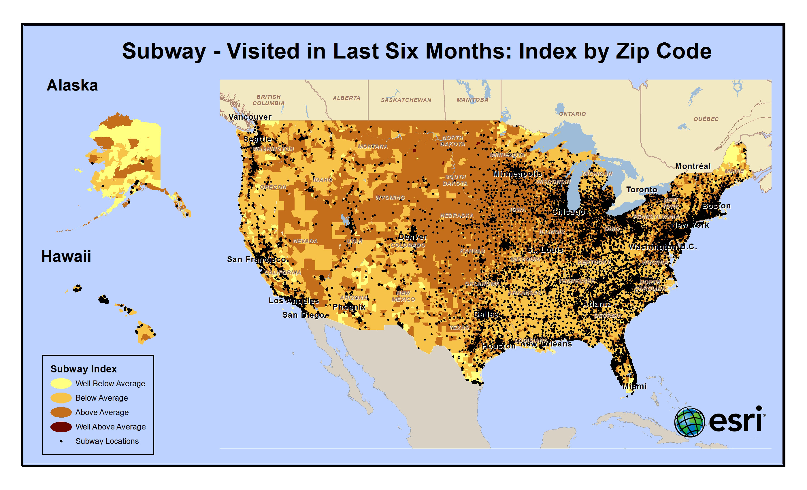 With Subway being everywhere, this means their customers are everywhere too. There are 36 zip codes that are tied for the highest index for visiting Subway at least once in the past 6 months. They have an index of 158. This means that someone in those zip codes is 1.58 times more likely than the average American to have visited Subway in the past 6 months. To put this in perspective, about 24.1% of Americans have visited Subway in the past 6 months.