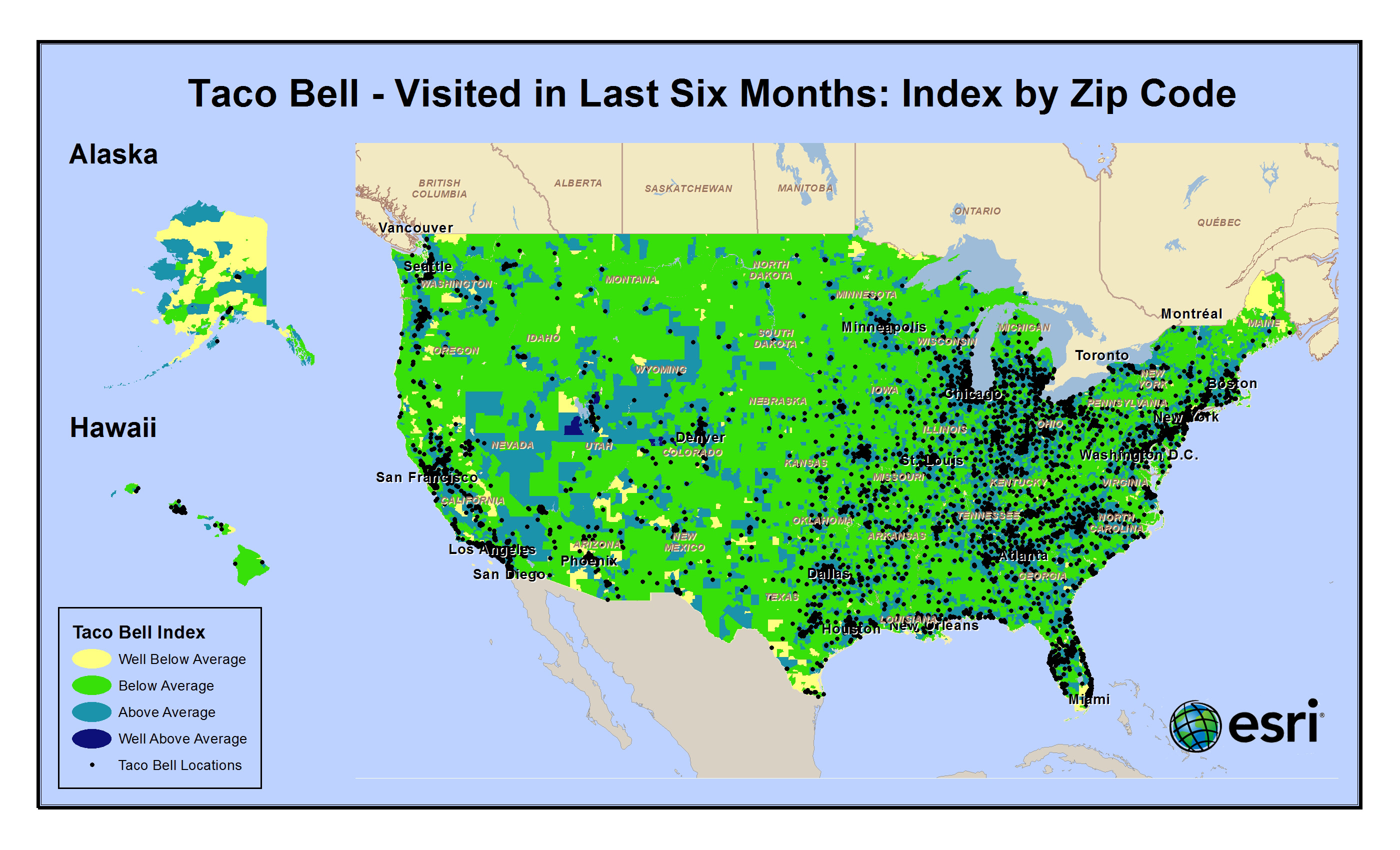 Other tapestry segments with residents that are frequent Taco Bell customers are Up and Coming Families and Aspiring Young Families. Census block groups where these segments are dominant have an index of 125 or higher for visiting Taco Bell at least once in the last 6 months.