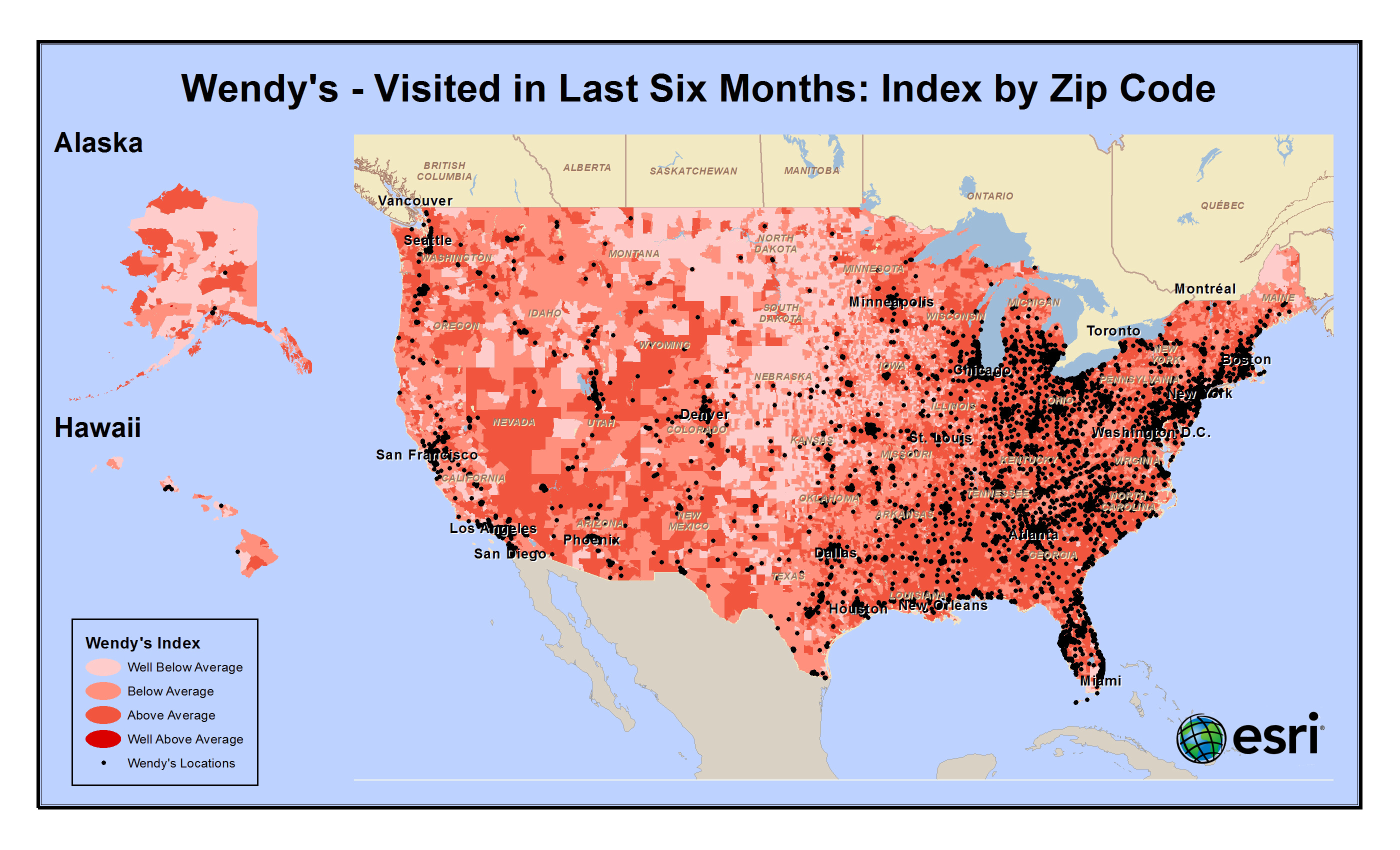 Residents from two tapestry groups frequent Wendy’s the most: Family Foundations and Great Expectations. 100% of the census block groups where these two segments are dominant have an index of 125 or higher for visiting Wendy’s at least once in the last 6 months. This means that residents in these groups are 1.25 times more likely to have visited Wendy’s.